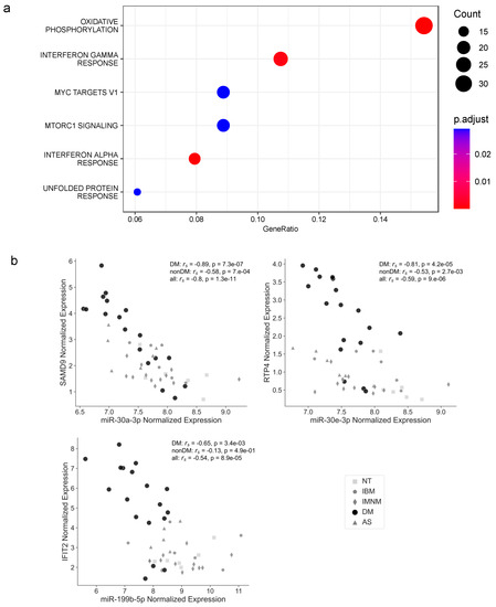 When we repeated this analysis by including only those mRNAs with an inverse correlation with their targeting miRNAs in AS or DM (hypothesizing that these mRNAs could be differentially expressed in these types of IIM due to their negative regulation by the miRNAs) only the enrichment related to cell cycle progression was significant in AS (with an adjusted p-value of 0.0002 for both the G2M checkpoint and E2F targets gene sets). In DM, the most significant enrichments of the differentially expressed targets with a significant inverse correlation with the differentially expressed miRNAs were found for the oxidative phosphorylation (p-adjusted = 1.21 × 10−8) and for the interferon alpha and gamma response-related genes (p-adjusted = 7.55 × 10−5 and p-adjusted = 0.001, respectively) (Figure 3a).