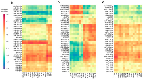 Correlation between the expression of differentially expressed miRNAs and relevant genes in IIM. Heatmap representation of the Spearman’s rank correlation coefficients between the expression levels of miRNAs that were differentially expressed in one or more types of IIM and genes that are stimulated by interferon (a), genes that are abundant in mature or differentiating muscle (b), or genes whose expression is enriched in immune cells (c) across all samples.