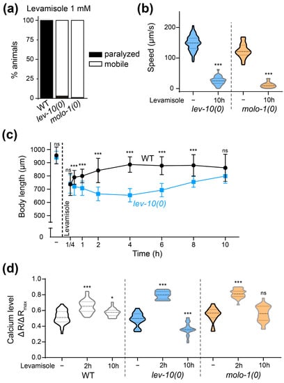 For all violin plots, dotted lines show quartiles, dashed lines denote mean and tests compare levamisole condition to the control of the same mutant. All error bars represent standard deviations from the mean. For all p values: *** p < 0.0005, ** p < 0.005, * p < 0.05, ns (not significant) p ≥ 0.05. Statistical analyses were performed using GraphPad Prism (GraphPad Software, Boston, MA, USA, https://www.graphpad.com/).