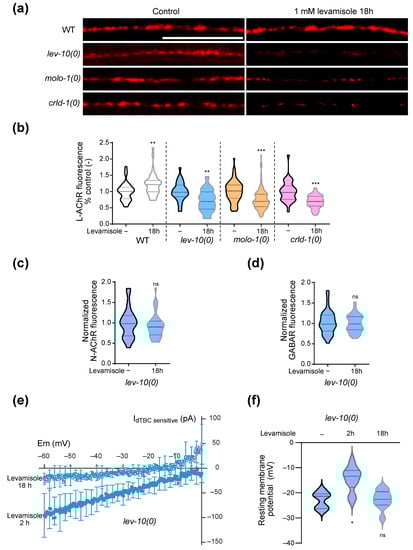 The decrease in L-AChR at the synapse could be due to a general decrease in the receptor at the membrane or to their delocalization outside the synapse. To distinguish between these two hypotheses, we measured the currents induced by levamisole on open-cut preparations of lev-10(0) worms after 2 or 18 h of levamisole exposure (Figure 2e). After 18 h on levamisole, levamisole current amplitudes were much smaller as compared to those recorded after 2 h on levamisole, and were almost absent at −30 mV. We also measured the membrane potential of muscle cells from lev-10(0) mutants without levamisole or after 2 and 18 h of levamisole exposure. As previously described [], muscle cells were depolarized after 2 h on levamisole (Figure 2f). However, after 18 h, membrane potential returned back to values similar to those before levamisole exposition (Figure 2f).