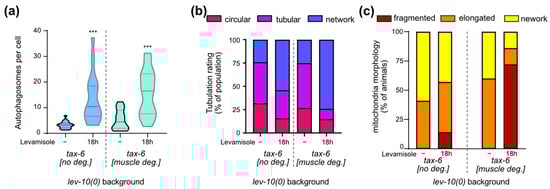 Using a single-copy reporter encoding the fluorescent wScarlet anchored to the mitochondrial outer membrane of muscle [], we visualized the overall morphology of mitochondria after 2 h and 18 h of levamisole exposure (Figure 4a,b). After 2 h exposure to levamisole, mitochondria became fragmented both in WT and lev-10(0). After 18 h on levamisole, mitochondria fragmentation had increased in WT muscle cells, while mitochondria from lev-10(0) were elongated and re-formed network.