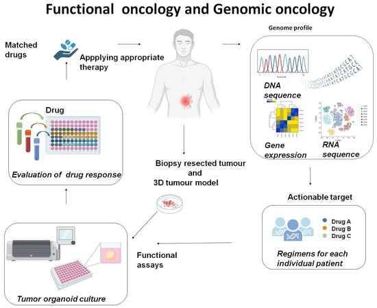 In the past decades, the genomic and epigenomic characteristics of tumour subtypes have been a focus of research. The hope has been to better classify sarcomas on the basis of genomic rearrangements and to identify vulnerable sites to target treatments [3]. Drug rediscovery protocol (DRUP) indicated that rare tumours, such as sarcomas, benefit from genomics-guided treatment [4]. This approach has indeed delivered some successes, such as in lung tumours harbouring neurotrophic receptor tyrosine kinase (NTRK) fusion treated with its inhibitor [5]; in non-small-cell lung cancers (NSCLCs) treated with molecules targeting BRAFV600E mutations [6]; and in gastrointestinal stromal tumours (GISTs) treated with c-Kit inhibitors [7]. However, precision oncology approaches to cancer treatment have indicated that, in many patients, genomic profiling is not sufficient to match each patient to an effective therapy [4,8,9]. Most frequently, this is due to genomic sub-variants unresponsive to drugs, the development of drug resistance, or the attenuation of drug activity by the tumour microenvironment [10]. To address these limitations, strategies combining genome profiling with personalised ex vivo assays are needed. For this purpose, 3D models are preferable to traditional 2D monolayer cell cultures because they better reflect tumour heterogeneity and the interactions between the tumour cells and extracellular matrix with the tumour microenvironment. Similarly, patient-derived xenograft (PDX) models in which fresh patient tumour tissues are directly transplanted into immunocompromised mice are better than xenografts because they maintain the histological, epigenetic, and genetic characteristics. However, mouse models require at least 6–7 weeks for engraftment, which is a long time for experiments and has a high cost. While three-dimensional models generated from patient’s biopsy samples [11] are valuable assays, easy and quick to establish, and useful to (1) understand the genomic basis for each patient’s disease that fuels cancer, (2) match patients with the best treatment possible selected on the basis of the tumour’s genetic aberration, and (3) improve patient survival rates [12] (Figure 1).
