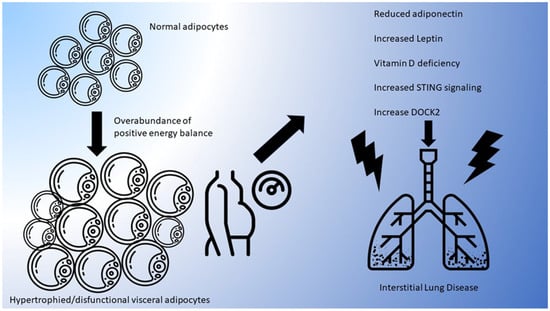 In summary, adipose tissue is a complex organ with critical endocrine and metabolic functions, in addition to its capacity for energy storage. In the setting of excess energy balance, adipose tissue expansion occurs through both hypertrophy and hyperplasia. In the visceral compartments, adipose tissue expansion occurs primarily through hypertrophy, which leads to the creation of larger, dysfunctional adipocytes with disordered signaling that serves as a catalyst for insulin resistance, metabolic dysfunction, and multisystem organ failure [22,23,24]. The mechanisms for this dysfunction include abnormal adipokine ratios, disordered communication with the surrounding extracellular matrix, preference for the creation of pro-inflammatory immune cells, and generation of reactive oxygen species [28,29]. Remaining to be understood are the specifics of how dysfunctional adipose tissue contributes to multisystem organ dysfunction, as observed in chronic lung diseases such as ILD.