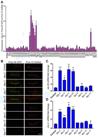In order to comprehensively analyze the regulation of collagens on innate immunity of the epidermis, we used RNAi to disrupt collagen proteins encoded by the DumPY (dpy, n = 10), COLlagen (col, n = 57), ROLler (rol, n = 1), BLIster (bli, n = 2), SQuaT (sqt, n = 2), and LONg (lon, n = 1) gene classes and three collagen modifying enzymes (dpy-11, dpy-18 and duox-2) one by one. We then tested for induction of the antimicrobial peptide using the transcriptional GFP reporter of nlp-29 in young adults. Consistent with previous reports, defects of any one of the seven collagens (DPY-2, DPY-3, DPY-7, DPY-8, DPY-9, DPY-10 and BLI-1) significantly enhances the fluorescence intensity of Pnlp-29::GFP [,,,] (Figure 1A,B). Unexpectedly, loss of other tested collagens and collagen modifying factors did not activate the expression of Pnlp-29::GFP (Figure 1A,B). QPCR results confirmed that loss of dpy-2, dpy-3, dpy-7 and dpy-10 upregulated the expression level of nlp-29, whereas inactivation of dpy-4, dpy-5, dpy-13 and dpy-17 did not affect nlp-29 expression (Figure 1C). In addition, another AMP gene, cnc-2, was also transcriptionally upregulated under RNAi treatment against dpy-2, dpy-3, dpy-7 or dpy-10 but not dpy-4, dpy-5, dpy-13 or dpy-17 (Figure 1D). No more collagen components were found to activate the immune response when damaged, suggesting that the seven collagens may be the core cuticle components for immune regulation.