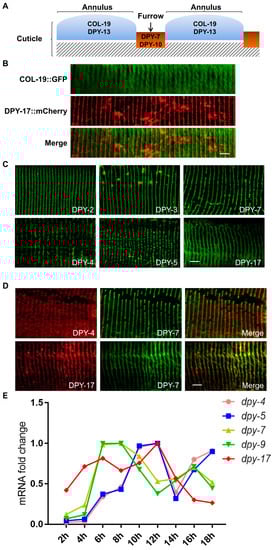 We next explored how specific collagens are organized into a damage sensor to activate innate immunity. Given that immunomodulatory collagens can impact the localization of MUP-4 (Figure 3C) [,], we firstly asked whether the immunomodulatory function of collagens correlates with their specific localization. The cuticle collagens generally exhibit as narrow stripes and broad stripes, corresponding to circumferential furrows and annuli, respectively (Figure 4A,B) []. It is known that DPY-7 and DPY-10 are located within furrows, while COL-19 and DPY-13 are located in annuli (Figure 4A,B) [,]. Thus, it is tempting to speculate that furrow collagens are responsible for immune regulation. To clarify the localization pattern of DPY-2, DPY-3, DPY-4, DPY-5 and DPY-17, we constructed transgenic strains expressing their mCherry fusion proteins. Unexpectedly, all of these collagens were displayed as narrow stripes similar to DPY-7 in young adults, suggesting that they are all located within furrows (Figure 4C). Double-labeling experiments showed that DPY-17 stripes were only positioned between the broad stripes of COL-19, and DPY-4 and DPY-17 were indeed co-localized with DPY-7 (Figure 4B,D). However, damage of DPY-4, DPY-5 or DPY-17 did not elicit an innate immune response like the insult of DPY-7 (Figure 1). It was previously found that formation of furrows requires DPY-7 and DPY-10 but not DPY-5 [,]. These findings reveal that not all furrow collagens affect immune responses, possibly because some of them are not essential for the formation of furrow structures.