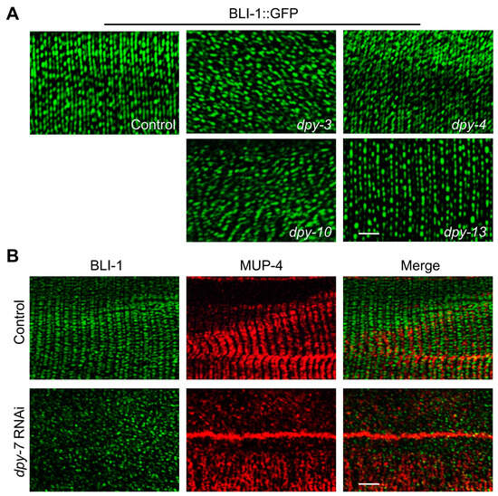 A previous study showed that DPY-2-labeled stripes are positioned in between but not overlapping CeHD stripes, indicating that DPY collagens do not act as direct ligands for MUP-4 to exert immune regulatory effects []. We next asked which cuticle component is responsible for the direct interaction with apical CeHDs in the immune regulation process. The destruction of the collagen BLI-1 elevates the expression of AMPs by disintegrating the MUP-4/STA-2 complex []. Moreover, its localization partly overlaps with MUP-4 stripes []. These findings makes BLI-1 the candidate collagen protein capable of mediating AMP induction through directly interacting with MUP-4. To determine whether BLI-1 is the missing link between DPY collagens and MUP-4 in the immune regulation process, we firstly examined the effect of DPY collagens on BLI-1 localization. The results showed that BLI-1 assumed a dotted line pattern in wild-type young adults, which was completely abolished by the AMP-inducing collagen damage (inactivation of dpy-3 or dpy-10) (Figure 6A). In contrast, the loss of dpy-4 and dpy-13 did not interfere with the periodic pattern of BLI-1, and as a result, no apparent AMP upregulation was detected (Figure 6A). We further explored the localization relationship between BLI-1 and MUP-4. The immunostaining of young adults showed that the spatial localization of BLI-1 and MUP-4 in CeHD regions was partly overlapped, suggesting a direct interaction between them (Figure 6B). Furthermore, we found that damage of DPY collagens with immune regulatory function resulted in remarkable separation of BLI-1 from MUP-4 (Figure 6B). In summary, we speculate that the specific substructure of DPY collagens modulates the innate immune response by affecting the interaction of BLI-1 with the immunoregulatory receptor MUP-4.