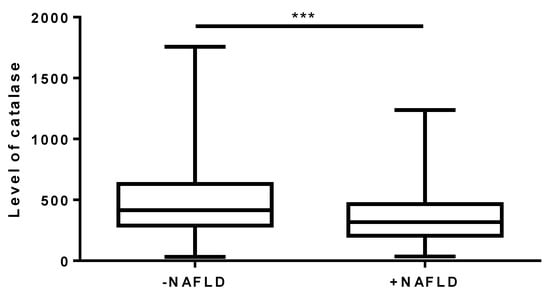CAT level in the group of patients with NAFLD (+NAFLD, n = 139) and without NAFLD (−NAFLD, n = 142), measured using ELISA test. The data are expressed as medians with lower and upper quartiles and minimal and maximal values. *** p < 0.001 −NAFLD group vs. +NAFLD group.