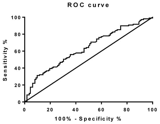 To explore the potential of CAT level as a diagnostic tool for NAFLD risk, ROC analysis was conducted (Figure 2). The optimal cut-point was determined by means of the Younden index method and was 473.55 U/L (AUC = 0.6335, p = 0.0006). Further, patients were divided into two subgroups according to the CAT level cut-off point. The difference in frequency of NAFLD between the subgroups was tested by the Chi square test with Yates correction (p = 0.0025). A CAT level higher than 473.55 U/L significantly reduced the risk of NAFLD (OR = 0.3936, 95% CI 0.2192–0.7065, p = 0.0025).