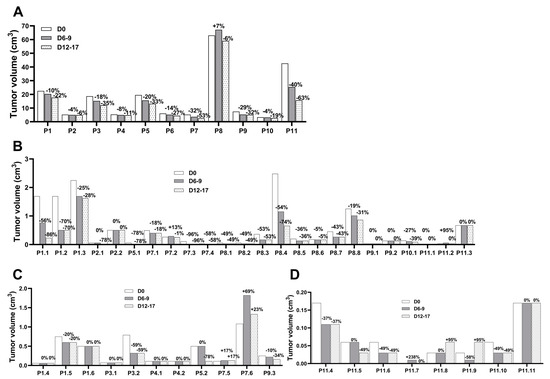 eCPMV immunotherapy induced tumor regression in target injected and noninjected CMC. (A) CMC patients received the first eCPMV injection in the target tumor at D0 and the second injection at D6–9, followed by surgery at D12–17. Tumor reduction was observed in noninjected tumors in both ipsilateral (B) and contralateral (C,D) mammary chains. Tumor volume is on the y-axis and the CMC patients with the tumor number, as described in Table 3, are listed in the x-axis. The percentage of tumor growth inhibition (%TGI) at the different days relative to D0 is indicated on top of each column.