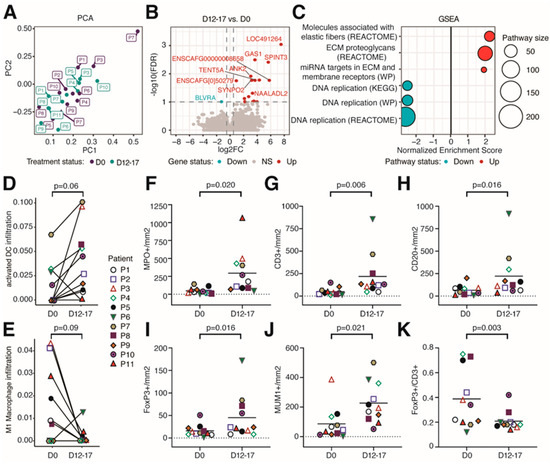 eCPMV immunotherapy modulated the tumor microenvironment in treated tumors. (A) Principal component analysis (PCA) of all samples analyzed via RNA-seq. (B) Volcano plot of differentially expressed genes comparing D12–17 to D0 gene expression. The horizontal dotted line indicates FDR = 0.1. Vertical dotted lines indicate a log2FC of −0.5 and 0.5. (C) Selected significant pathways from Gene Set Enrichment Analysis (GSEA) results comparing gene expression between D0 and D12–17 samples. (D) Infiltration of activated dendritic cells comparing D0 and D12–17 samples. p-value calculated using paired Wilcoxon signed-rank test. (E) Infiltration of M1 macrophages between D0 and D12–17. p-value calculated via paired Wilcoxon signed-rank test. Through IHC, canine patients treated with eCPMV immunotherapy had a significant increase in the number of neutrophils (MPO+; (F)), T lymphocytes (CD3+; (G)), B lymphocytes (CD20+; (H)), Treg lymphocytes (FoxP3+; (I)), and plasma cells (MUM1+; (J)), and the FoxP3+/CD3+ ratio (K) was significantly reduced. Each companion dog is represented by a colored individual shape as indicated in plot 3D-E. X-axis indicates the day when biopsies were taken; y-axis indicates the number of cells per square millimeter. p-value obtained via paired Student t-test.