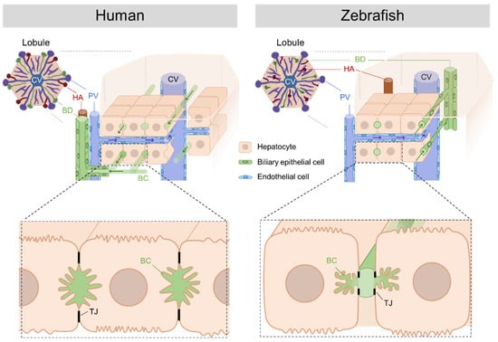 Comparison of the structure of the human and zebrafish liver. The human liver consists of the smallest tissue unit, the polygonal hepatic lobule. The zebrafish liver is thought to have a structure similar to that of the human liver lobule, although it is not structurally less distinct than that of humans. In humans, intrahepatic bile ducts composed of cholangiocytes (biliary epithelial cells) are restricted to the periportal zone, whereas in zebrafish, they are randomly distributed throughout the hepatic lobule. In humans, bile synthesized in hepatocytes is transported through bile canaliculi and microvilli-lined ducts between the hepatocytes connected by tight junctions and then through intrahepatic and extrahepatic bile ducts. In contrast, zebrafish transport bile from hepatocytes through preductules/ductules, which form a mesh-like network with bile canaliculi, and then through the intra- and extrahepatic bile ducts. The liver organ structures include the central vein (CV); portal vein (PV); hepatic artery (HA); bile duct (BD); bile canaliculi (BC); and the tight junction (TJ). The figure presents these structures and was created with BioRender.com (accessed on 26 August 2023).