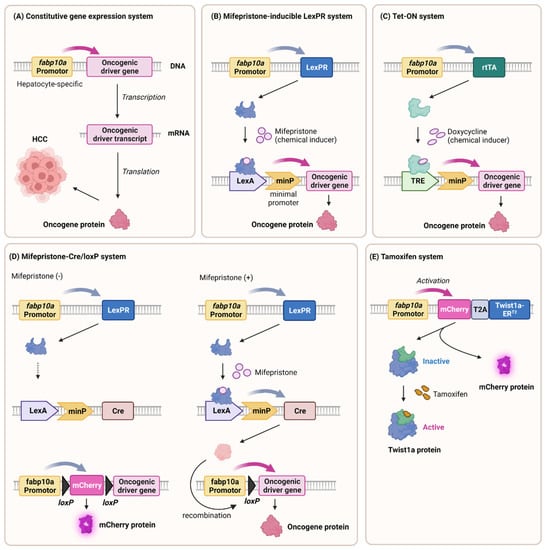 Generation of HCC transgenic zebrafish models. The strategic integration of oncogenic driver genes downstream of the hepatocyte-specific gene expression promoter (fabp10a) has been shown to significantly promote the development of hepatocellular carcinoma (HCC), which involves the following: (A) a constitutive gene expression system, (B) a mifepristone-inducible LexPR system (C) a Tet-on system (D) a mifepristone–Cre/loxP system (E) and a tamoxifen–inducible system. The list provides examples of typical oncogenic driver genes that have been implicated in the induction of HCC in zebrafish. The figure was created with BioRender.com (accessed on 27 August 2023).