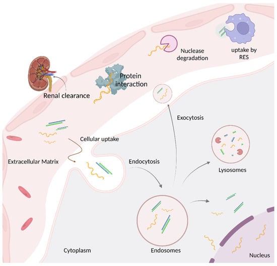Biological barriers preventing therapeutic activity of oligonucleotides. Systemically administered oligonucleotides encounter nuclease degradation, RES phagocyte uptake, protein interaction, and renal excretion before reaching the specific tissue/cell of interest. On reaching the tissue/cell, intracellular uptake occurs via endocytosis. Most oligonucleotides either get trapped in endosomes and further transferred to lysosomes where they encounter enzymatic degradation or are recycled back into extracellular matrix via exocytosis. Only 1–2% of administered oligonucleotides escape the endosomes to reach the target in cytosol or nucleus. Created with BioRender.com, AO25FLAM37.