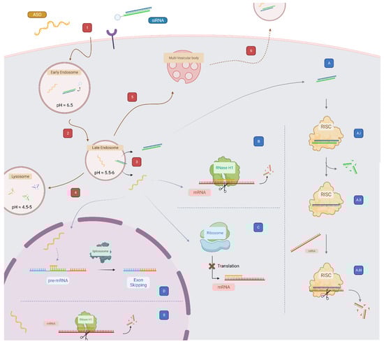Summary of trafficking and mode of action of ASOs and conjugated siRNAs. (1) Oligonucleotides are first internalized into the endosomal pathway by gymnotic uptake or by receptor-mediated uptake, (2) in early endosomes, dissociation with the targeting moiety or ligand is initiated, and (3) maturation of the early endosome leads to late endosomes where oligonucleotides are found to escape in the cytosol. Late endosomes can either mature to (4) lysosomes, where most of the material is degraded by the low-pH and degradation enzymes, or (5) to Multivesicular bodies where they are (6) exported to the external environment. In the cytoplasm, (A.I) siRNAs are loaded into RISC, where (A.II) the passenger strand is degraded and the guide strand selected. After target recognition by the guide strand (A.III), the mRNA transcript is cleaved and degraded. For ASOs, they can either (B) degrade the target mRNA through the RNAse H1 enzyme or (C) block the translation machinery of the transcript. In the nucleus, ASOs can interfere with (D) the splicing machinery and generate a modified mature mRNA or (B) directly downregulate the target through RNAse H1. Created with BioRender.com, VP25FLPEXQ.