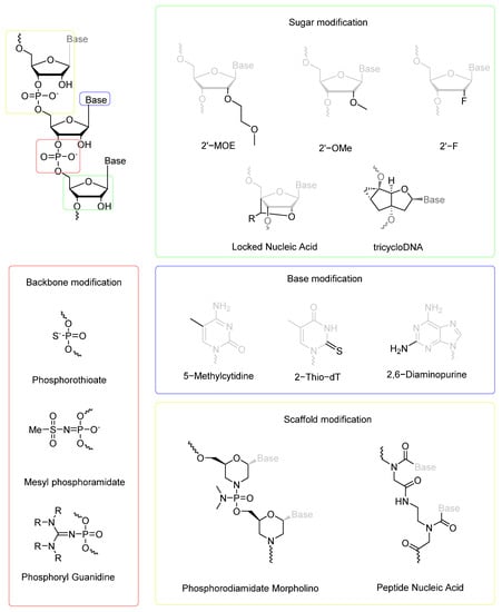 A range of modifications have been introduced to enhance ASO stability, efficacy, and delivery. The most common modifications consist of (i) substituting the phosphodiester (PO) backbone with a phosphorothioate (PS); (ii) modifying the 2′ position of the ribose; (iii) incorporating 5-methyl group on pyrimidine nucleobases; or (iv) introducing an artificial biopolymer scaffold, such as a PMO or peptide-nucleic acid (PNA) (Figure 3).