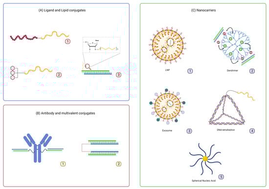 Oligonucleotide delivery systems have been thoroughly described previously [1,69], therefore, selected delivery approaches will be briefly mentioned in this review, including both direct ligand conjugation strategies and nanocarrier technologies (Figure 4).