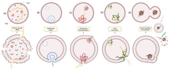 Proposed mechanisms of endosomal escape. (A) Proton-sponge effect: buffering polymers or small molecules induce increased inflow of protons, counterions, and water molecules into endosomes, resulting in high osmotic pressure and hence endosomal rupture; (B) membrane fusion: ionizable lipids containing fusogenic lipids fuse with endosomal bilayer and hence releases the oligonucleotides into cytosol; (C) membrane destabilization: polymers containing pH-sensitive scaffolds interact with anionic endosomal membrane and induce membrane destabilization; (D) pore formation: some endosomolytic peptides form pores in endosomal membrane, which allows escaping of oligonucleotides into cytosol. It can be of two types such as barrel-stave pore formation and toroidal pore formation. (E) Vesicle budding and collapse: some endosomolytic peptides induce budding and collapse of CPP-containing vesicles from endosomal membrane. Created with BioRender.com, JF25FK1RLE.