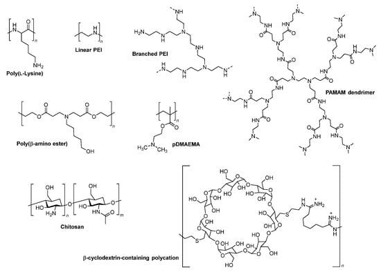 Chemical structures of selected endosomal buffering polymers that are commonly used in gene delivery studies. Poly(L-lysine) and polyethylenimine (PEI) are among the earliest used buffering polymers. Several other polymeric vectors, such as polyamidoamine (PAMAM) dendrimers, degradable poly(β-amino esters) (PBAEs), poly[(2-dimethylamino)ethyl methacrylate] (pDMAEMA), and various carbohydrate-based polymers (chitosan and β-cyclodextrin-containing polycations), have also been explored to improve safety and efficacy.