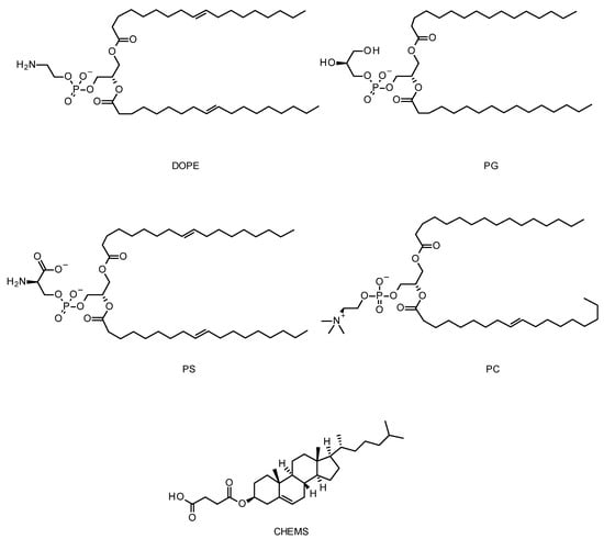 Chemical structures of some examples of lipids used in LNPs. Dioleylphosphatidylamine (DOPE), phosphatidylglycerol (PG), phosphatidylserine (PS), phosphatidylcholine (PC), and cholesteryl hemisuccinate (CHEMS).