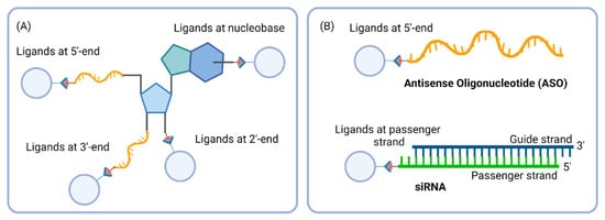 (A) Ligand conjugation sites in oligonucleotides. (B) Preferred ligand site conjugation in ASO and siRNA. Created with BioRender.com, LN25GKFR3K.