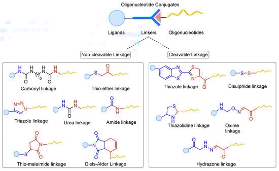The employed linkers to conjugate the ligands to the oligonucleotides dictate the stability of ligand–oligonucleotide conjugates in plasma and play a significant role in their biophysical properties, pharmacokinetic behaviour, and therapeutic efficiency. A well-designed linker should be stable in plasma to avoid premature conjugate cleavage and enable efficient release of active drug at the targeted site of action. Both length and nature of the linkers can affect the therapeutic property of oligonucleotides. Therefore, optimizing the structure of the linker is essential to maximize the conjugated-oligonucleotide activity. Schematically, linkers are divided into two categories: non-cleavable and cleavable linkers.