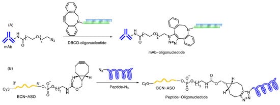 Oligonucleotides containing triazole linkages formed using SPAAC reaction. (A) mAb-siRNA conjugates containing DBCO as strained alkyne; (B) Ang II peptide-ASO conjugate containing BCN as strained alkyne.