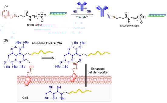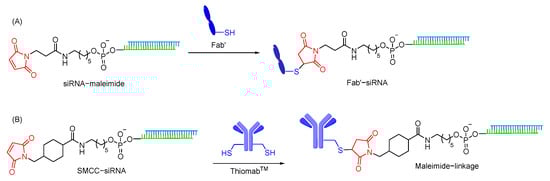 Thiol-maleimide linkages are widely used to conjugate oligonucleotides when non-cleavable linkers are required for oligonucleotide delivery. A maleimide moiety can be easily introduced into the ligand or oligonucleotide using succinyl spacers [218]. The maleimide motif acts as a Michael acceptor and rapidly reacts with the free thiol group to form thiol-maleimide linkage. As this linkage can be prepared in an aqueous buffer without a catalyst, thiol-maleimide linkage has become a commonly used linkage to conjugate oligonucleotides with various ligands, such as antibodies [219], and cell penetrating peptides [203,220,221]. However, thiol-maleimide linkages are susceptible to in vivo reduction, resulting in premature release of oligonucleotides from the ligand [222,223]. The use of retro-Michael ring opening of thiol-maleimide linkage is an alternative approach to overcome the potential reduction possibilities [203,224,225]. Anti-CD71 Fab antibody–siRNA conjugates (ARCs) using thiol-maleimide linkage enable to achieve significant gene silencing in muscle tissues [226]. Furthermore, siRNA is conjugated with ThiomabTM antibodies, containing engineered site-specific cysteine, using SMCC linker that contains thiol-maleimide linkage. It is reported to induce gene silencing in various cell lines (Figure 13) [227].