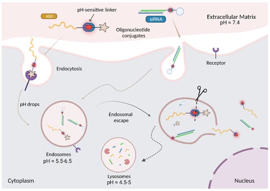 Unlike small molecule therapeutics, oligonucleotide therapeutics are large polyanionic molecules, which do not readily diffuse across the cellular membrane. Both receptor and non-receptor targeted oligonucleotides are initially internalized by various endocytic mechanisms, depending upon cells and brought into the early endosomes (EEs) [27]. Oligonucleotides—whether non-conjugated, ligand-conjugated, or associated with nanocarriers—are gradually trafficked from the EEs to late endosomes (LEs) to downstream multivesicular bodies (MVBs) and finally to lysosome (LYs) for degradation (Figure 2) [98,99,100]. In this event, oligonucleotide therapeutics experience an environmental change in pH (7.4–4.5) as they travel along the endocytic pathway [31]. In addition, while oligonucleotides are stable in endosomal compartments, small amounts can be recycled back to the extracellular space through exocytosis [101]. Therefore, it is crucial for the oligonucleotides to escape from endosomes before lysosomal degradation and recycling events to maximize their therapeutic effect.