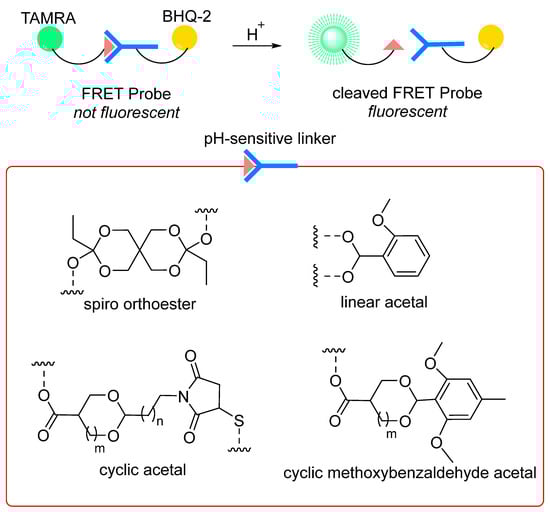 - Jacques, S.A.; Leriche, G.; Mosser, M.; Nothisen, M.; Muller, C.D.; Remy, J.S.; Wagner, A. From solution to in-cell study of the chemical reactivity of acid sensitive functional groups: A rational approach towards improved cleavable linkers for biospecific endosomal release. Org. Biomol. Chem. 2016, 14, 4794–4803. [Google Scholar] [CrossRef]