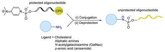 - Kropacheva, N.O.; Golyshkin, A.A.; Vorobyeva, M.A.; Meschaninova, M.I. Convenient Solid-Phase Attachment of Small-Molecule Ligands to Oligonucleotides via a Biodegradable Acid-Labile P-N-Bond. Molecules 2023, 28, 1904. [Google Scholar] [CrossRef] [PubMed]