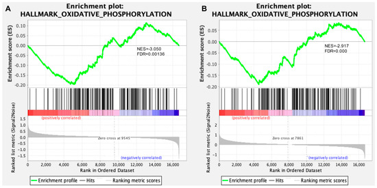 Gene Set Enrichment Analysis (GSEA) supports defective mitochondrial oxidative phosphorylation as a key pathological hallmark of AD. GSEA plots showing enrichment of the “hallmark_oxidative_phosphorylation” gene set in the hippocampus (A) and retina (B) of in comparison to wt controls. The top portion of each GSEA plot shows the running enrichment score for validated genes as it moves down the ranked list. The bottom portion of each plot shows the value of ranking matrices as it moves down the list of ranked genes. The colored horizontal bar indicates a shift from positively correlated genes (red) to negatively correlated genes (blue). The normalized enrichment scores (NES) and false discovery rate q value (FDR q) are indicated. Further details on GSEA plots can be found at Broad Institute web site (http://www.broadinstitute.org/gsea/index.jsp, accessed on 20 April 2023).