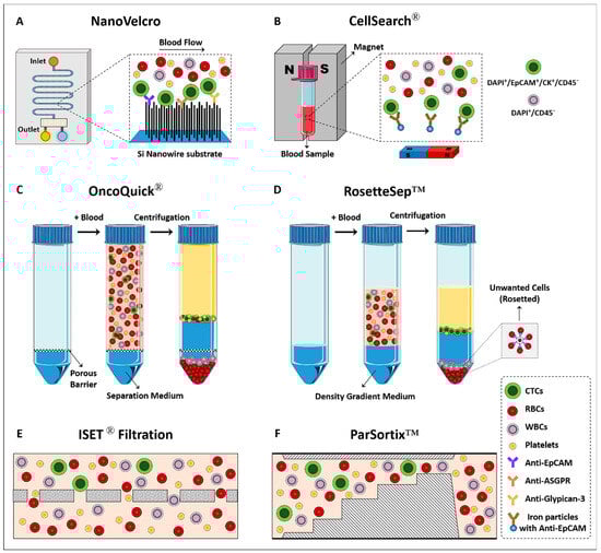 To date, various specific tumor markers, including HER2, PSA, EGFR (epidermal growth factor receptor), EpCAM, and MUC1 (mucin-1) have been used to isolate CTCs; among these, EpCAM has been extensively used [41,42]. This marker is often expressed in cells with epithelial origins and is not present in blood cells. Therefore, it can be used to isolate CTCs originating from epithelial tumors (e.g., HCC) [43]. Racila et al. reported that cancer cells could be detected in the circulation by using immunomagnetic and flow cytometry techniques [44]. They detected CTCs based on their expression of EpCAM and non-expression of CD45. These markers would become the basis for the initial definition of CTCs and were used to develop some CTC detection methods like the CellSearch® System (Figure 2) [45]. CellSearch® is an example of an EpCAM-affinity-based platform for CTCs’ enrichment. This system is the only FDA-approved method for capturing CTCs that utilizes ferrofluid nanoparticles conjugated with anti-EpCAM antibodies to capture CTCs in 7.5 mL blood samples. Isolated CTCs are then fixed and stained with DAPI and a cocktail of fluorescence-tagged antibodies against epithelial cytokeratins (CKs) and CD45 (leukocyte-specific marker) markers. DAPI+/EpCAM+/CK+/CD45− cells are considered to be CTCs, while DAPI+/CD45+ cells are considered to be leukocytes [45]. In 2015, Kelley et al. used the CellSearch System to isolate EpCAM-positive CTCs in metastatic HCC samples [46]. In another study conducted by Sun et al., the prognostic value of CTCs isolated with the CellSearch® System in HCC patients undergoing curative resection was investigated, and EpCAM-positive CTCs were detected in 66.67% of patients prior to resection [47]. The conjugation of EpCAM-affinitive agents to magnetic beads, and then the collection of the captured CTCs through a magnetic field, is another popular method that has been used to enrich CTCs from the blood of patients [39]. In 2015, Pilapong et al. developed magnetic nanoparticles conjugated to anti-EpCAM DNA-based aptamers to isolate CTCs related to HCC [48]. However, the lower sensitivity and recovery rate of CTCs significantly limited its wide clinical application [24].