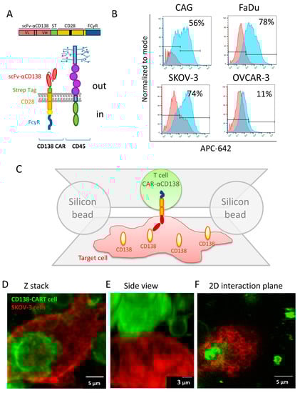 CAR design and cell-on-cell interaction method. (A) A schematic description of the CD138-CAR design and CD45. (B) FACS analysis for CD138 expression in different cell lines (CAG, FaDu, SKOV-3 and OVCAR-3). (C) A schematic representation of the cell-on-cell imaging approach. (D–F) Confocal imaging of two cells labelled with membrane dyes: CD138-CAR-T cell with DiO (green) on a SKOV-3 adherent cell, labelled with DiD (red). (D) Z-stack image of cell on cell. (E) Side view of the 3D confocal image in panel (D) of the two cells. (F) 2D plane of interaction between the two cells in panels (D,E). Scale-bars in panels (D,F) 5 µm or in panel (F) 3 µm.