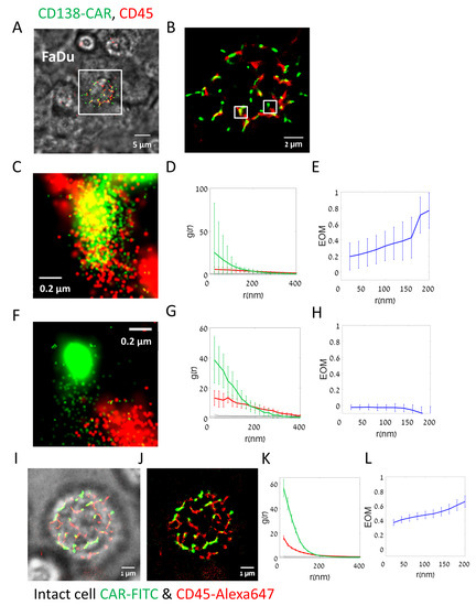 Two-color super resolution imaging on CD138-CAR-T upon interaction with target cell line. (A–H) Fluorescently labelled CD138-CAR-T cell on FaDu target cell. (A,B) Direct STORM (dSTORM) imaging of CD138-CAR-T cell on FaDu target cells. CD138 CAR-T was labelled with αSTREP tag-FITC (green) and αCD45-Alexa647 (red). Shown is an overlay of bright-field imaging merged with fluorescence two-color dSTORM imaging. (B) Zoom in on the fluorescent image of the CAR-T cell in panel (A). (D,G) Zoom in on the fluorescent image in two small areas (~4 µm2) inside the CAR-T cell in panel (B). (E,F) Pair-correlation function of CD138-CAR receptor (green) and CD45 molecules (red) within zoom regions in panel (C) (N = 4 regions), as represented in panels (D,G). (G,H) The extent of mixing (EOM) between CD138-CAR and CD45 within the zoom regions in panel (C) (N = 4 regions), as represented in panels (D,G). Scale-bars in panels A5 µm, in panel (B) 2 µm and in panels (D,G)—0.2 µm. Error bars are SEM. (I–L). Fluorescently labelled CD138-CAR-T intact cell, without a target cell. (I) Direct STORM (dSTORM) imaging of CD138-CAR-T intact cell, without a target cell on the bottom coverslip. CD138-CAR-T was labelled with αSTREP tag-FITC (green) and αCD45-Alexa647 (red). Bright-field imaging was merged with fluorescent two-color dSTORM imaging. (J) Fluorescent image only of the CAR-T cell in panel (I). (K) Pair-correlation function of CD138-CAR receptor (green) and CD45 molecules (red). (L) The extent of mixing (EOM) between CD138-CAR and CD45.