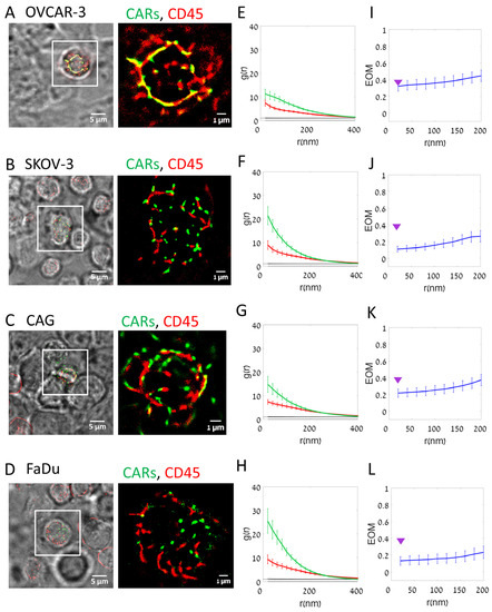 Imaging of fixed cells could involve artefactual clustering of molecules that might affect the physiological patterns that occur at the interface between CAR-T cells and engage on- and off-target cells. Thus, we employed our imaging technique to study live cell conjugates of CAR-T cells and the on- and off-target cells (Figure 4). We note that the molecular patterns seemed slightly smoother in these images (compare Figure 4A–D to Figure 3A–D; esp. in panels B,C of both figures). Likewise, the PCF statistics still showed significant self-clustering of CARs and CD45 under all conditions, yet to a lower extent than for the fixed cells. Importantly, as found for fixed cells, CARs self-clustered to a higher extent on the on-target cells relative to the off-target cells (OVCAR-3) (compare Figure 4, panel E with panels F,G and H). Differences in segregation of CARs from CD45 were also evident (compare Figure 4, panel I with panels J–L).