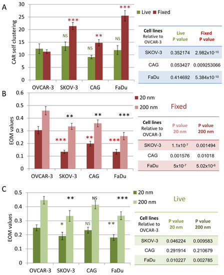 Extent of mixing and CAR self-clustering comparing in target vs. non-target cell lines. (A) A comparison of CD138-CAR self-clustering upon cell-on-cell interaction. Table on right summarizes p-values between target and non-target cells. (B,C) A comparison of EOM values on different cell lines at 20 nm and 200 nm in images of (A) fixed cells and (B) live cells. Error bars are SEM. Tables on right summarize p-values between target and non-target cells. Stars indicate p-values * p < 0.05, ** p < 0.01, *** p < 0.001. NS—non-significant.