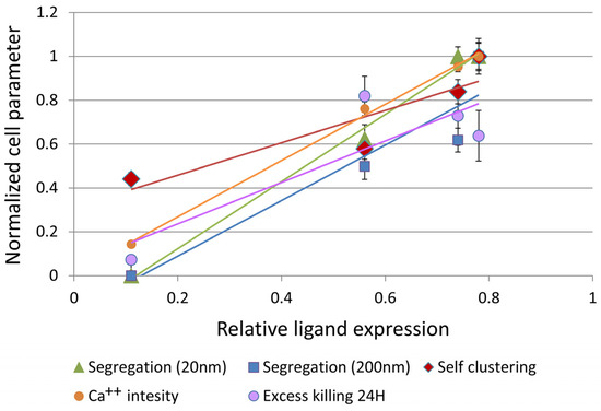 Correlation between normalized cell parameters and relative ligand expression. A plot of normalized cell parameters as a function of relative ligand expression (percent positive cells, measured by FACS). The parameters include: Segregation (i.e., 1-EOM) at 20 nm (calculated from Figure 5B); Segregation at 200 nm (calculated from Figure 5B); Self-clustering at 20 nm (Figure 5A); Ca++ influx (Figure 6A); Excess killing (i.e., killing extent of cell line—killing of OVCAR-3, calculated from the MTT assay in Figure 6D). Error bars are SEM.