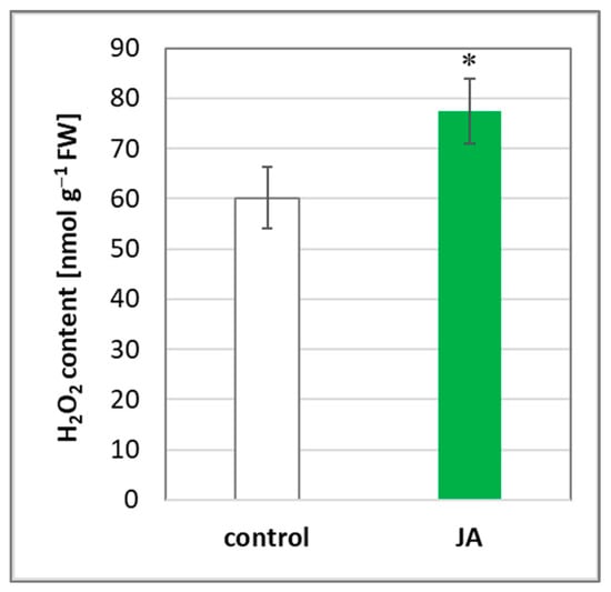 H2O2 level in cucumber roots. Plants were treated for 24 h with 1 µM JA or without this hormone (control). Results are means ± SD of three independent experiments run in triplicate. Statistically significant differences (t-test) between the control and treatment are marked by * (p < 0.05).