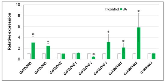Relative expression level of CsRBOH genes in cucumber roots. Real-time PCR analysis was performed with the CsCACS reference gene used to normalise the results. RNA was isolated from the roots of control plants and plants treated with 1 µM JA for 24 h. Results are means ± SD of 4–6 replications of two independent experiments. Statistically significant differences (t-test) between the control and treatment are marked by * (p < 0.05).