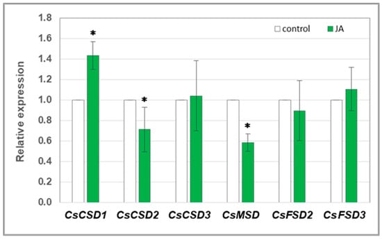 Relative expression level of genes encoding SOD isoforms in cucumber roots. Real-time PCR analysis was performed with the CsCACS reference gene used to normalise the results. RNA was isolated from the roots of control plants and plants treated with 1 µM JA for 24 h. The results are means ± SD of six replications of two independent experiments. Statistically significant differences (t-test) between the control and treatment are marked by * (p < 0.05).