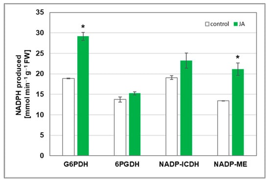 Activity of enzymes involved in NADPH generation in cucumber roots. Plants were treated for 24 h with 1 µM JA or without this hormone (control). Presented results are means ± SD of two independent experiments, each run in triplicate. Statistically significant differences (t-test) between the control and treatment are marked by * (p < 0.05).