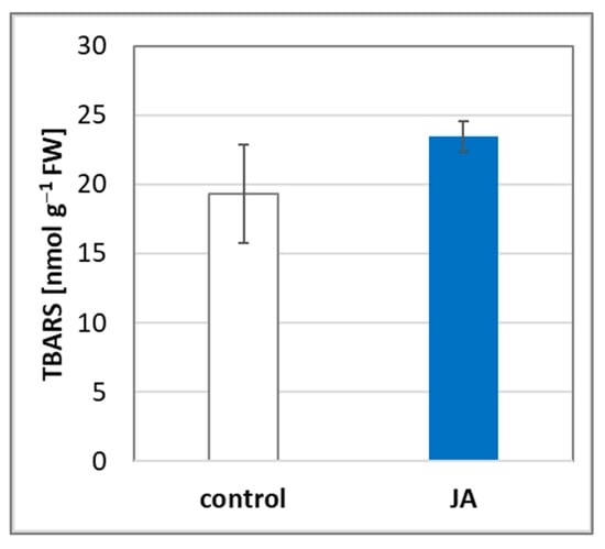 TBARS level in cucumber roots. Plants were treated for 24 h with 1 µM JA or without this hormone (control). Results are means ± SD of three independent experiments run in triplicate. There were no statistically significant differences between control and treatment (t-test, p < 0.05).