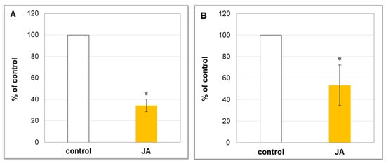 Plasma membrane H+-ATPase activity, measured as ATP hydrolysis (A) and ATP-driven proton transport (B), in cucumber roots. Plants were treated for 24 h with 1 µM JA or without this hormone (control). Results are means ± SD of 3–4 independent experiments run in triplicate. Hydrolytic activity of H+-ATPase reached 758 µg Pi h−1 mg−1 protein in control samples (100%). Mean ATP-dependent H+ transport of control samples was 2.068 A495 min−1 mg−1 protein (100%). Statistically significant differences (t-test) between the control and treatment are marked as * (p < 0.05).