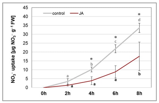 Nitrate uptake by cucumber roots. Plants were treated for 24 h with 1 µM JA or without this hormone (control). After treatment, plants were incubated with 0.5 mM KNO3 in Mes-NaOH (pH 5.5). Data are the means of at least six biological repetitions. Different letters represent homogeneous groups, independently in control plants and JA-treated plants, according to Duncan’s test (p < 0.05). Statistically significant differences (t-test) between the control and treatment in the same time interval are marked as * (p < 0.05).