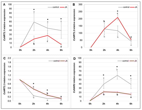 Relative expression level of CsNRT2.1 (A), CsNRT2.2 (B), CsNRT2.3 (C), and CsNAR2 (D) genes in cucumber roots. Real-time PCR analysis was performed with the CsCACS reference gene used to normalise the results. RNA was isolated from the roots of control plants and plants treated with 1 µM JA for 24 h. After treatment, plants were incubated with 0.5 mM KNO3 in Mes-NaOH (pH 5.5). Data are the means of at least three replications of two biological repetitions. Different letters represent homogeneous groups, independently in control plants and JA-treated plants, according to Duncan’s test (p < 0.05). Statistically significant differences (t-test) between the control and treatment in the same time interval are marked by * (p < 0.05).