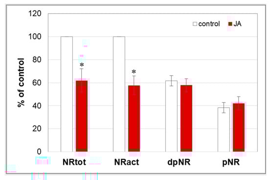 Nitrate reductase (NR) activity in cucumber roots. Plants were treated for 24 h with 1 µM JA or without this hormone (control). NR activity was expressed as total (NRtot) and actual (NRact) activity according to the Materials and methods. Based on NRtot and NRact values, the level of unphosphorylated (dpNR) and phosphorylated (pNR) forms of NR was estimated. Results are means ± SD of three independent experiments run in triplicate. Some 904 (NRtot) and 547 (NRact) nmoles of NO2− h−1 g−1 FW was considered as 100%. Statistically significant differences (t-test) between the control and treatment are marked by * (p < 0.05).
