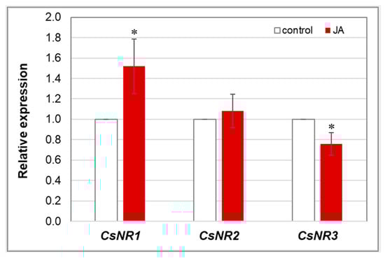 Relative expression level of CsNR genes in cucumber roots. Real-time PCR analysis was performed with the CsCACS reference gene used to normalise the results. RNA was isolated from the roots of control plants and plants treated with 1 µM JA for 24 h. Results are means ± SD of six replications of two independent experiments. Statistically significant differences (t-test) between the control and treatment are marked by * (p < 0.05).