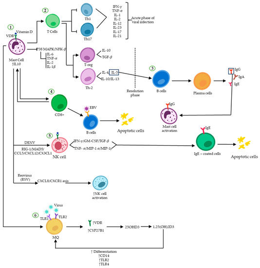 MQs as phagocytic cells are essential for engulfing and destroying infected cells and viral particles. MCs can be recruited and activated by these immune cells through the secretion of pro-inflammatory cytokines such as TNF-α and IL-1. The activation of TLR1/2 on MQs by viral components leads to the expression of CYP27B1 and VDR, which are involved in vitamin D metabolism and signaling. Vitamin D promotes the differentiation of MQs. Additionally, it increases the expression of CD14, a pathogen recognition molecule, and TLRs 2 and 4 in MQs [85]. The available data on the interaction between VDR and viral proteins and cellular transcription factors indicate that vitamin D may play a role in viral infections.