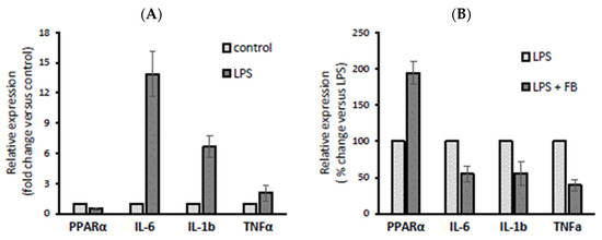 Recent studies have indicated that PPAR-α activation plays an important role in the function of innate and adaptive immune cells [6]. Cholangiocytes, which are primarily affected in cholestatic diseases, are now recognised as active players in immune pathogeneses, which induce immune-mediated ductular damage and release mediators regulating immune function [18]. Therefore, we evaluated the effect of the PPAR-α agonist fenofibrate (FB) on pro-inflammatory cytokines in normal human cholangiocytes (NHCs). In comparison with unstimulated NHCs, their incubation with LPS (100 µM) reduced PPAR-α by 53% (p = 0.006) and upregulated IL-6 and IL-1b after 24 h (p = 0.001 and p = 0.002, respectively; Figure 1A). Alternatively, pre-treatment with FB (200 µM) for 2h prior to LPS stimulation upregulated PPAR-α by 90% (p = 0.001 vs. LPS; Figure 1) and suppressed IL-6, IL-1b, and TNFα (by 46%, p = 0.006 vs. LPS; by 45%, p = 0.003 vs. LPS; and by 60%, p = 0.001 vs. LPS, respectively; Figure 1B).