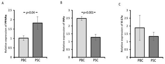 Ductopenia and portal inflammation in PBC result from direct immune reactions focused on intrahepatic cholangiocytes. In PBMCs isolated from PBC patients, the expression of PPAR-α was reduced, whereas IFNγ was upregulated compared with PSC patients (p = 0.04 and p = 0.001, respectively; Figure 2A,B). No difference was observed between these groups regarding IL-17a mRNA expression (p = 0.47; Figure 2C).